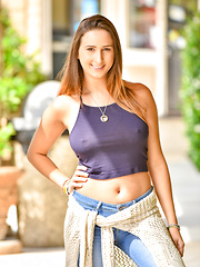 This lovely brunette babe loves to flash her shaved pussy and to share her flawless teen body with us in public places.