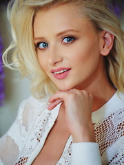 Blonde bombshell with sparkling blue eyes, Nena looks inviting as she's sprawled in bed wearing her matching white lingerie