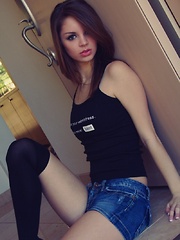 Busty Haleen, with her creamy fair body, alluring brown eyes, naughtily lifting the hem of her dress to allow a peek of her shaved, pink pussy.