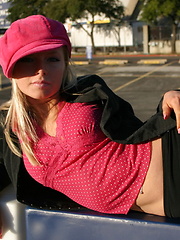 Perfect blonde teen Skye lifts her skirt and shows off her perfect ass in the Dallas Cowboys stadium parking lot