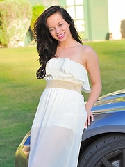 Brunette beauty Eva Angelina strips from her sexy summer outfit, getting naked outdoors.