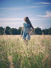 Brunette Carole wearing a beautiful and colourful summer dress.