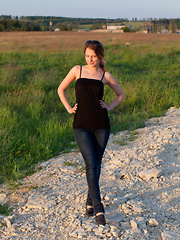 Newcomer Lucie strips outdoors baring her sweet tits and trimmed pussy.