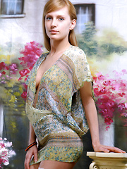 Young and innocent Colleen A in a sheer yellow lingerie dress
