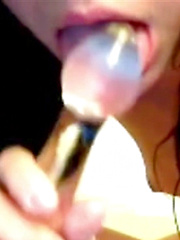 Feisty nerdy Danni Cole in her sexy pink undies licks and sucks her dildo